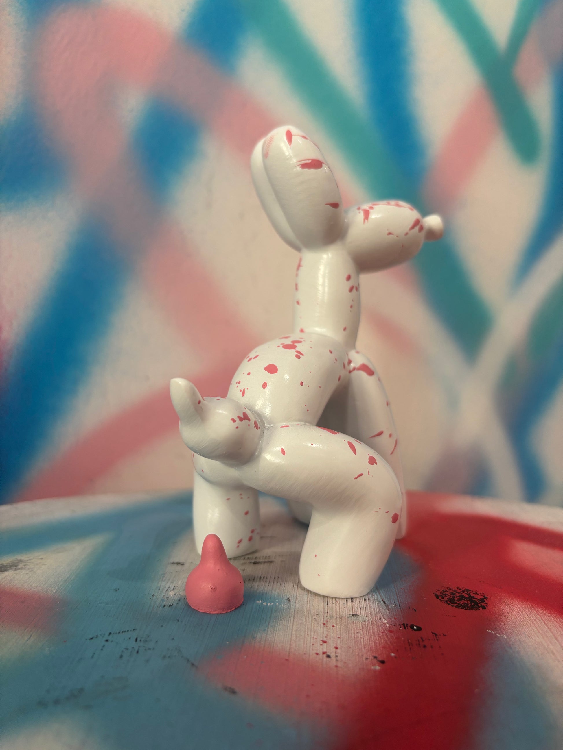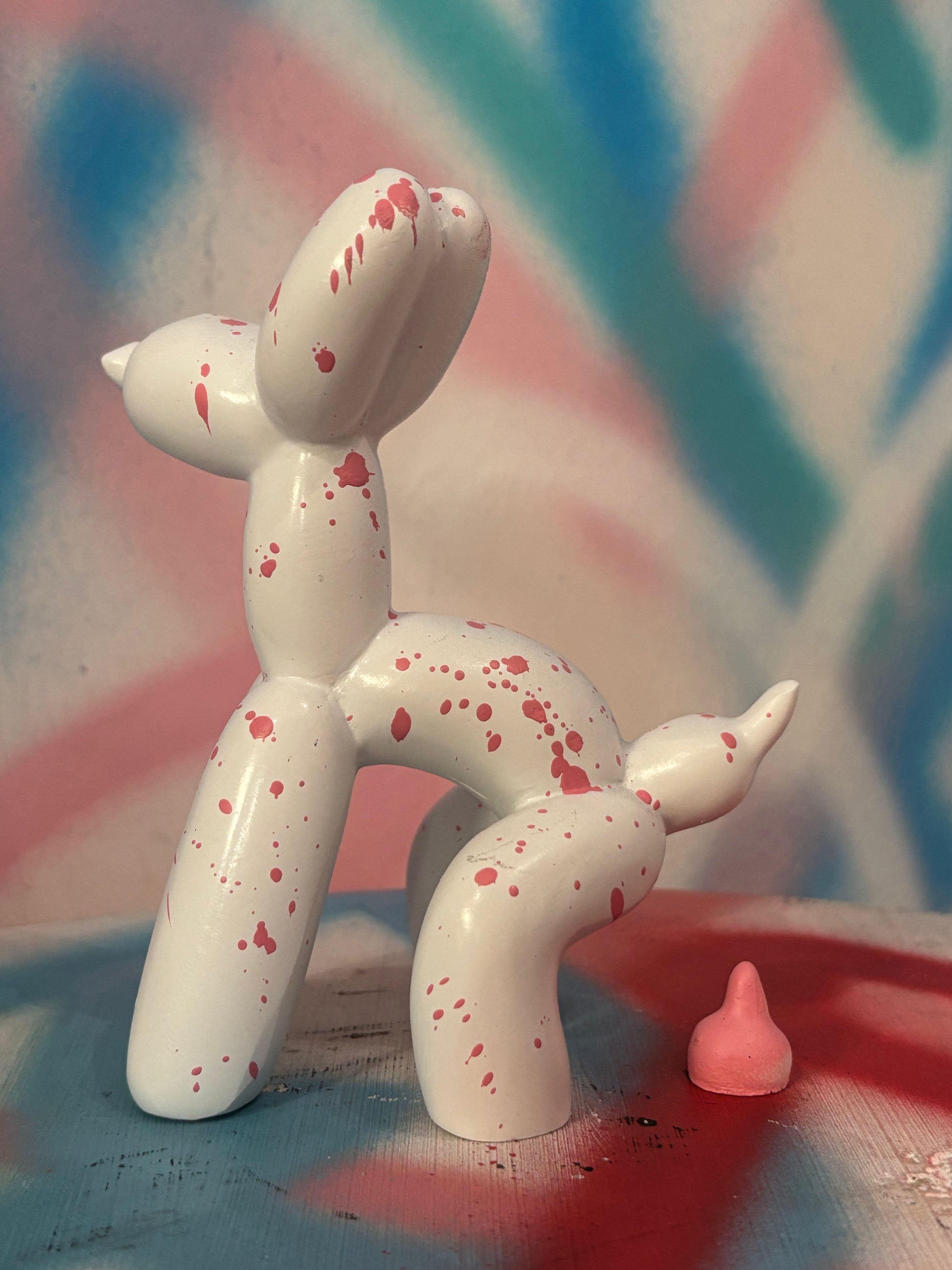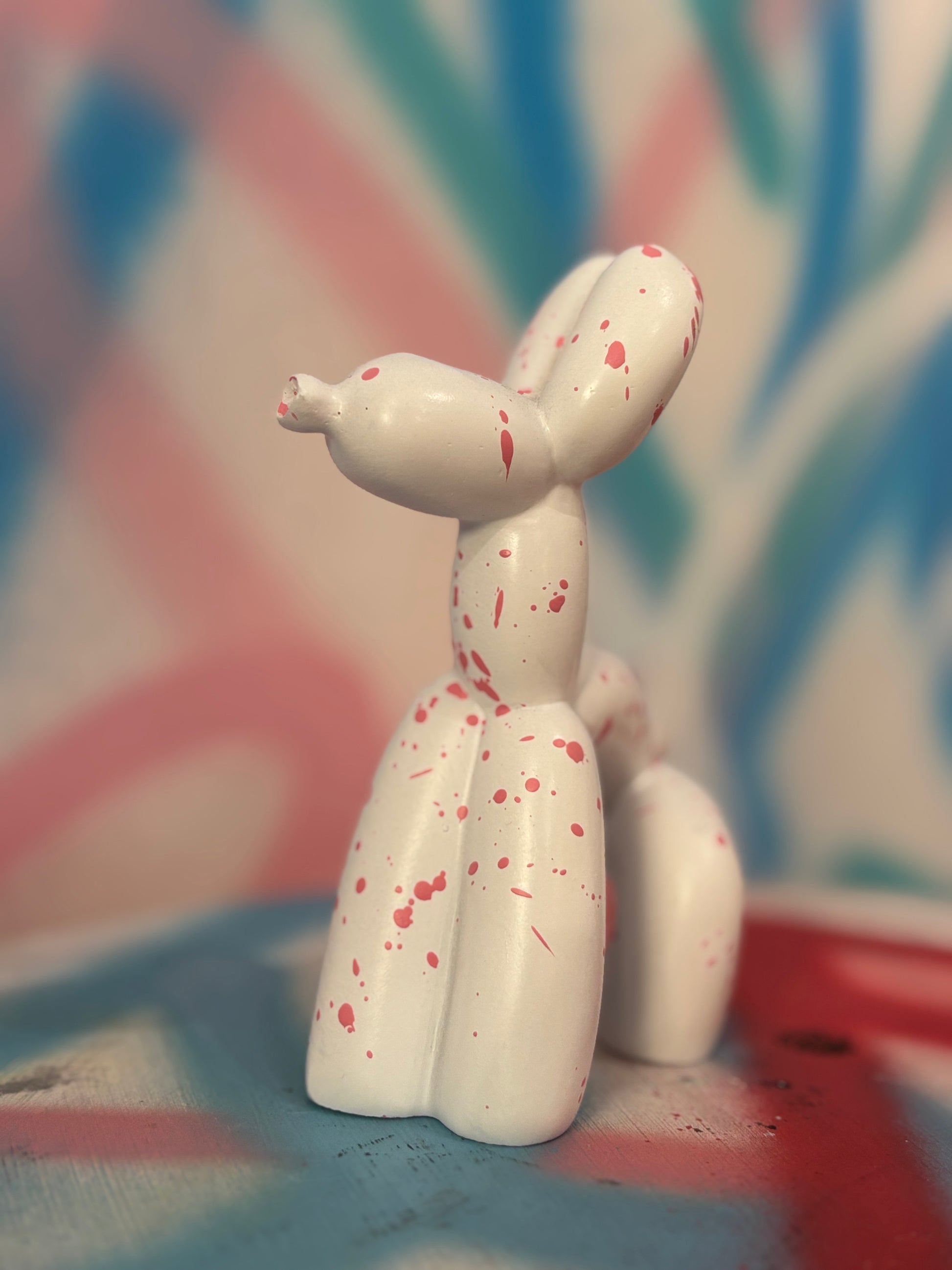Scultura in ceramica ispirata ai celebri Balloon Dogs, reinterpretata con un tocco pop delicato ma irriverente.