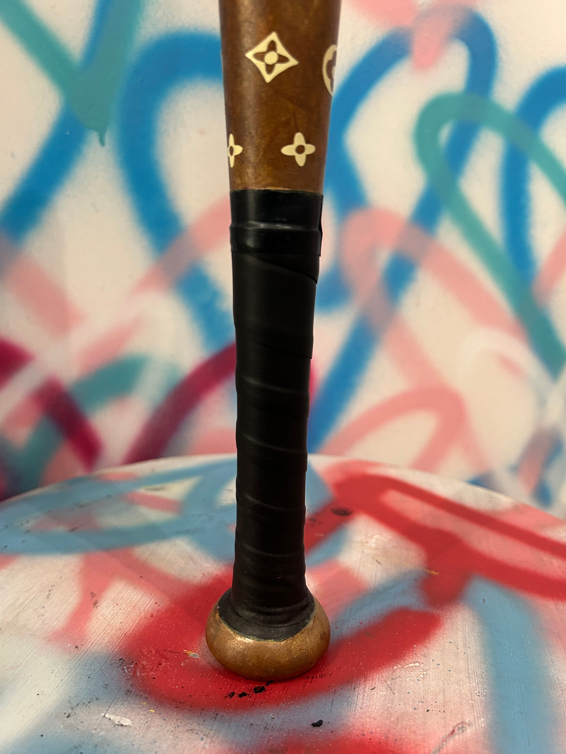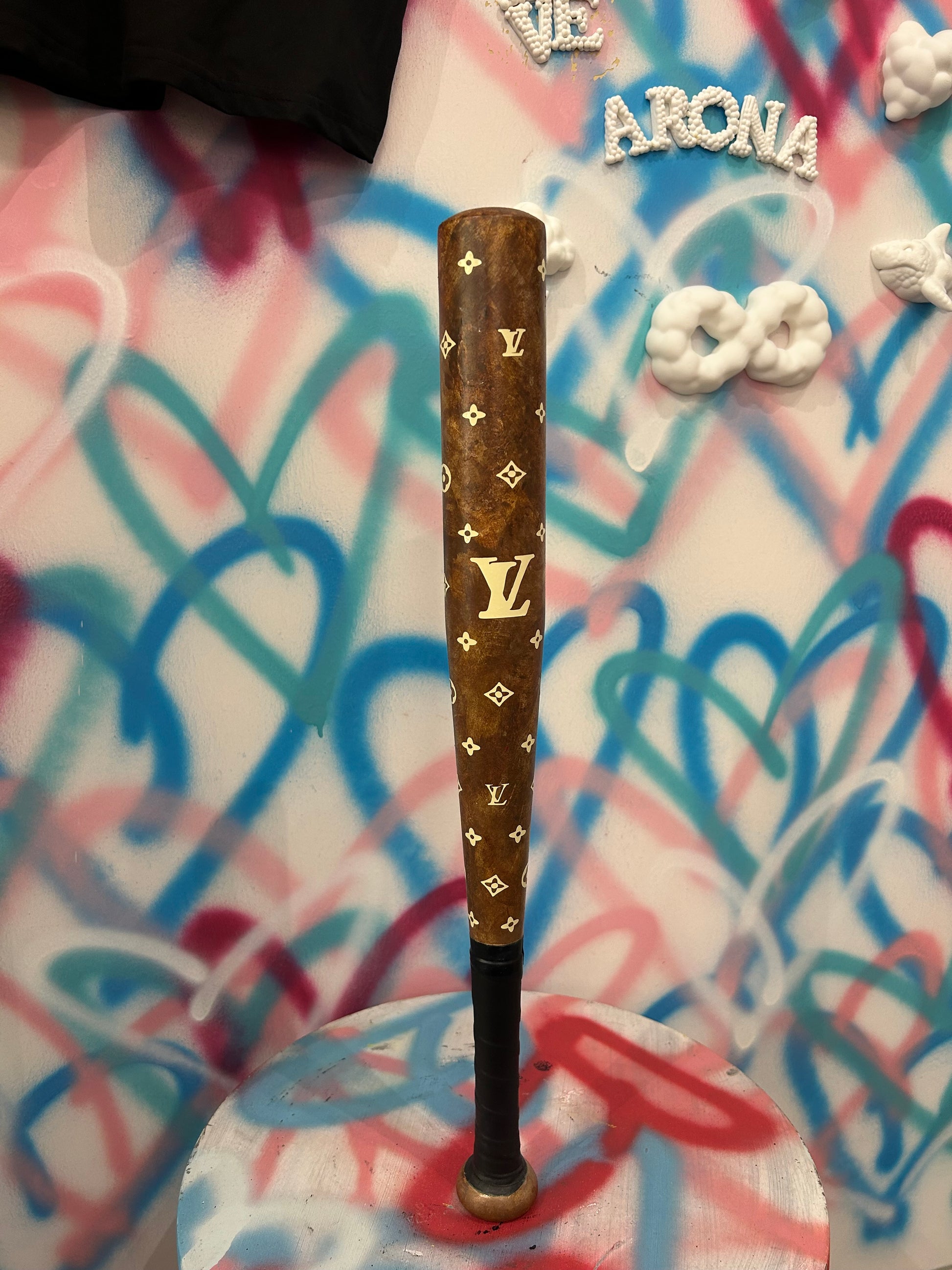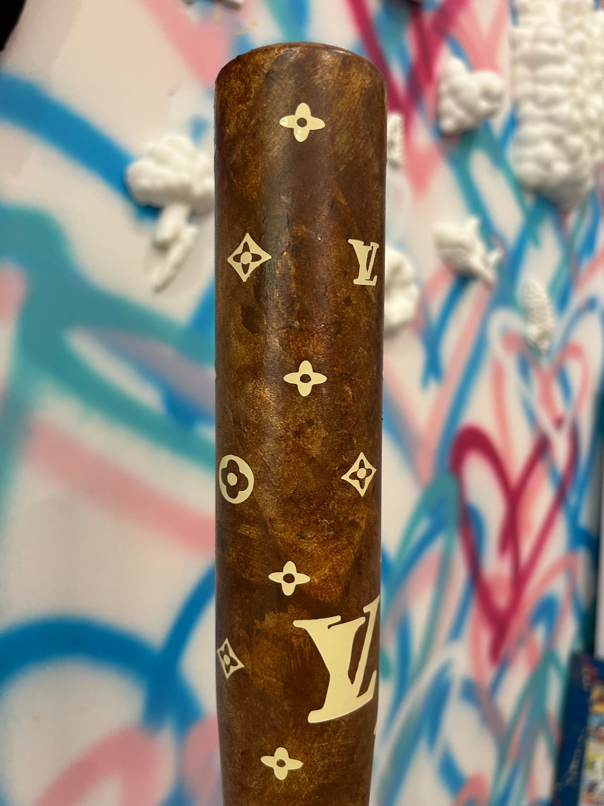 Mazza ispirata al famoso marchio francese LV. Decorata e dipinta a mano. Impronte, difetti e colature rendono ciascun esemplare autentico e irripetibile.