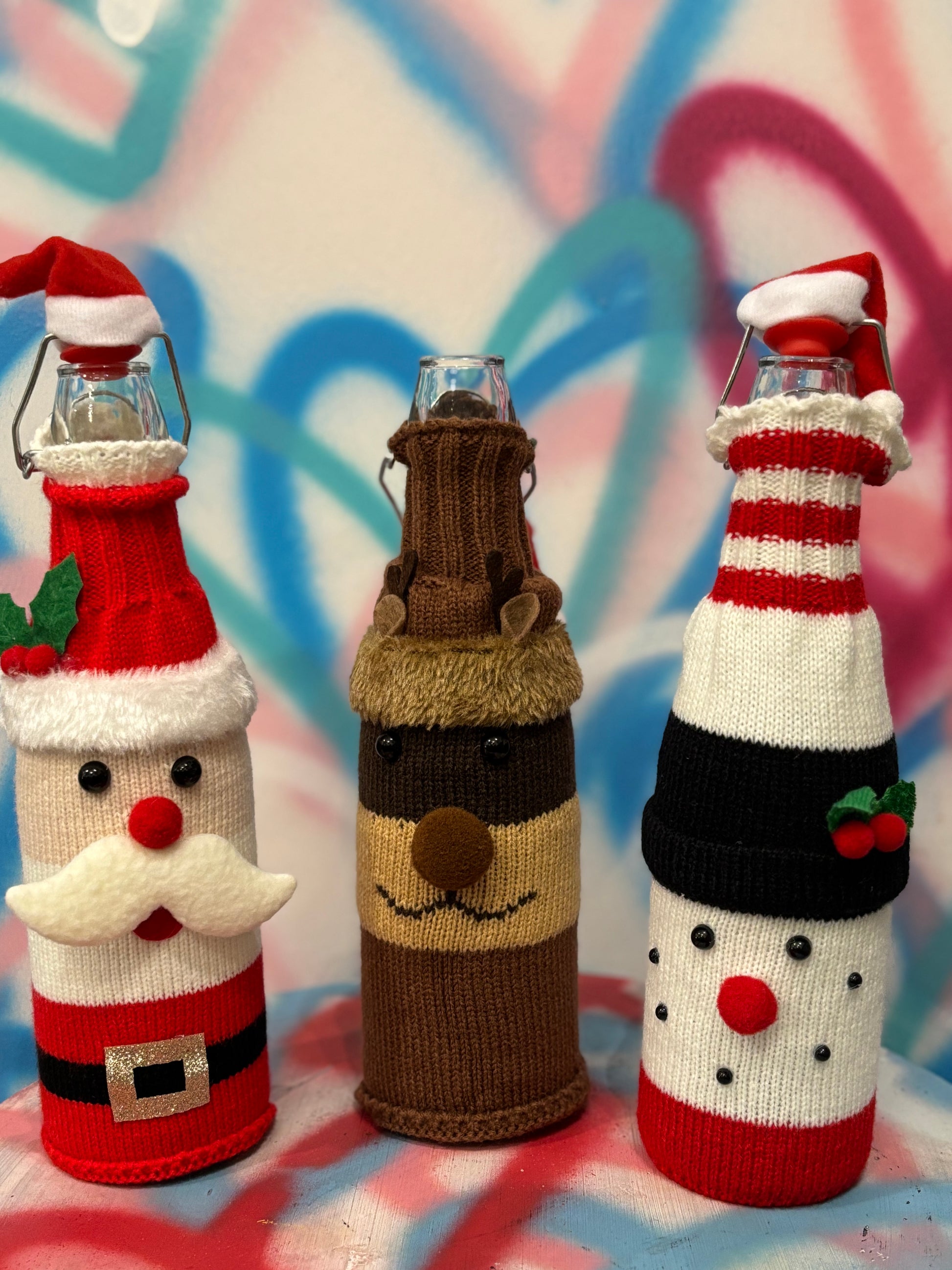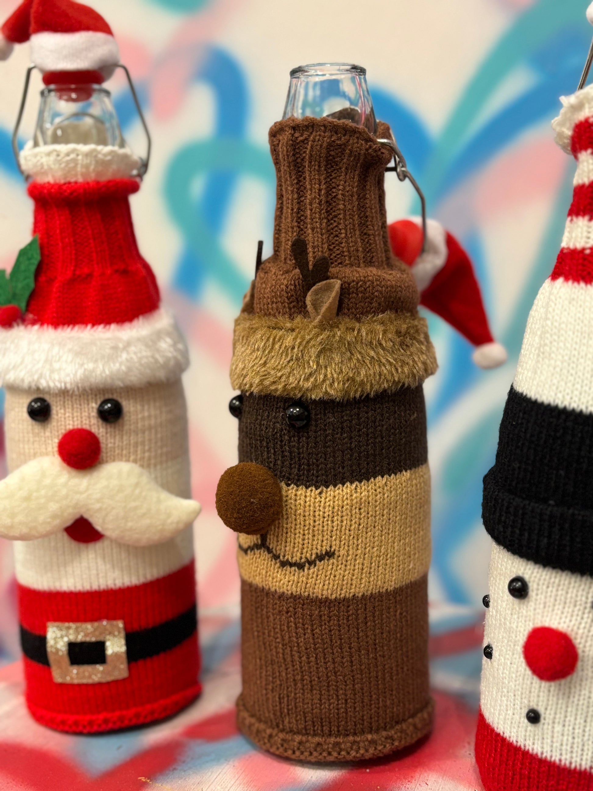 Vestito a maglia di va babbo Natale, Pupazzo di neve o Renna. Ogni bottiglia ha il suo cappellino di Natale nel tappo.