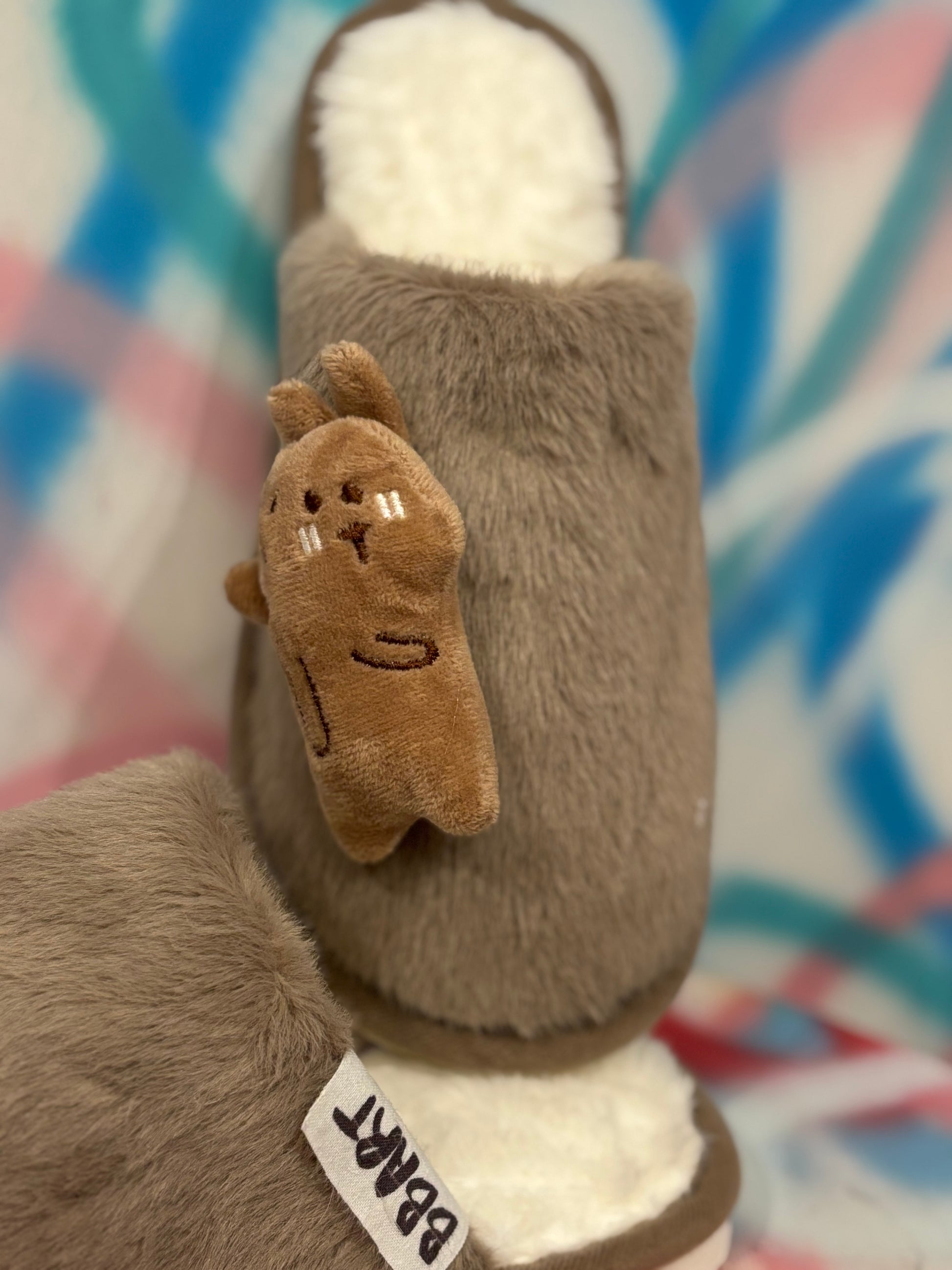 Dolcissime e super soffici, queste pantofole color biscotto sono decorate con un topolino kawaii in stile peluche, ispirato ai piccoli roedores come i hámster o topolini delle favole.