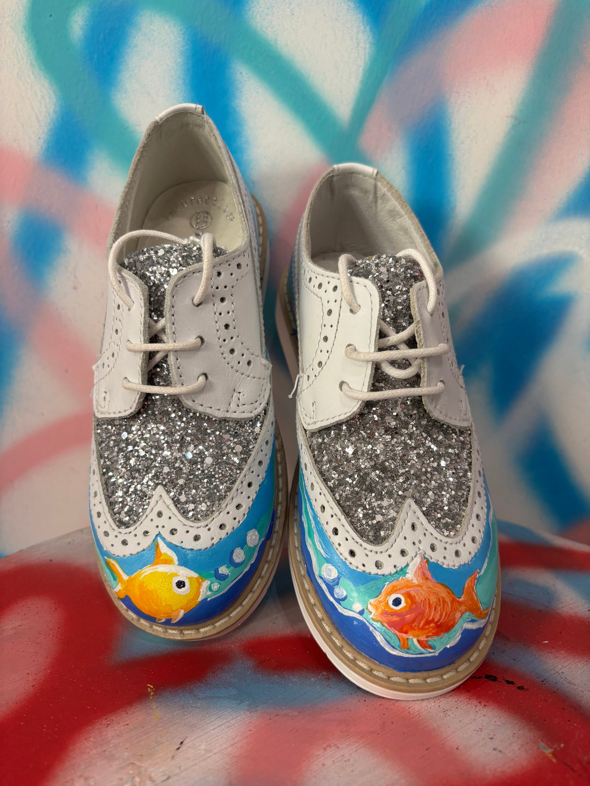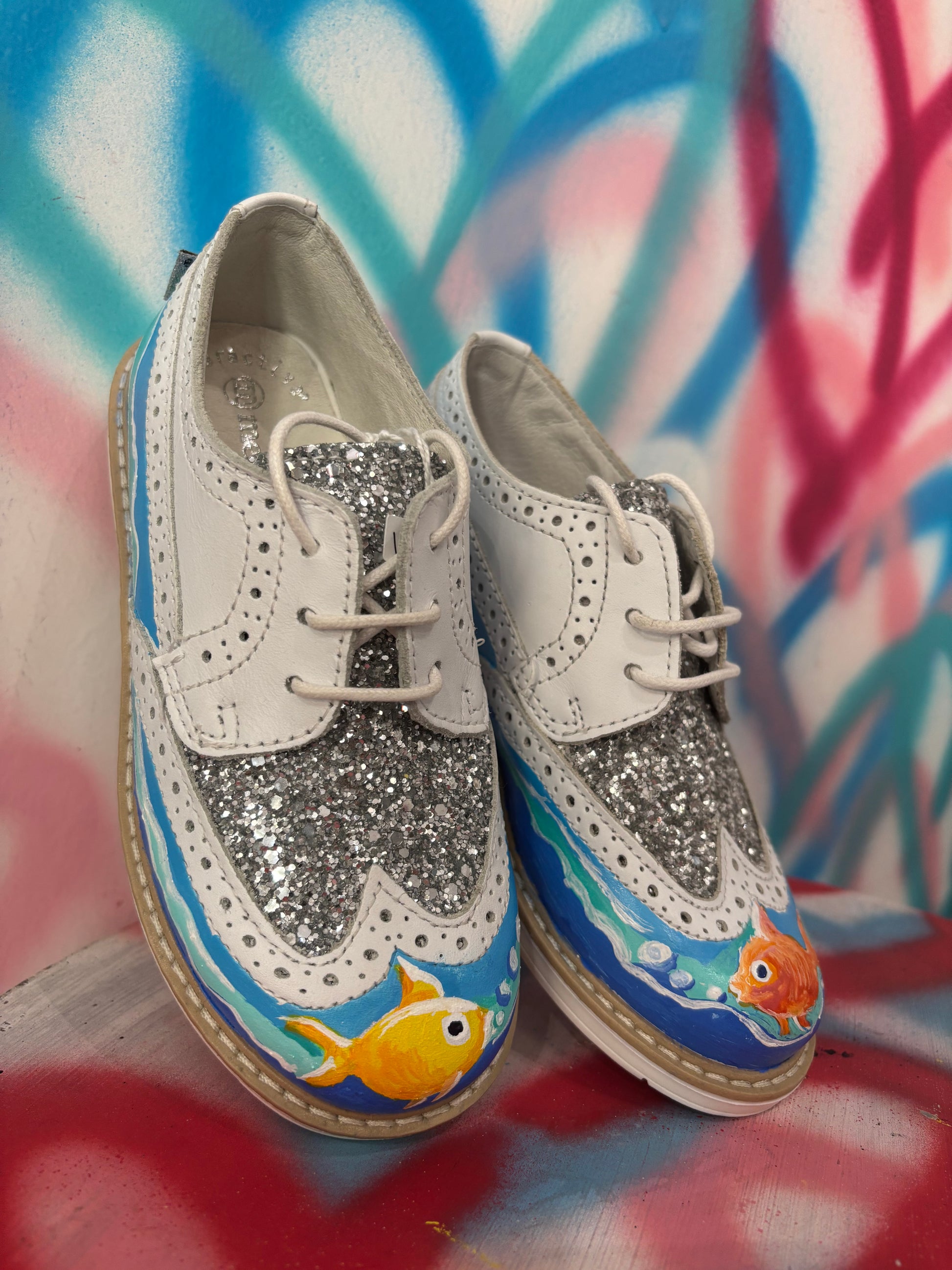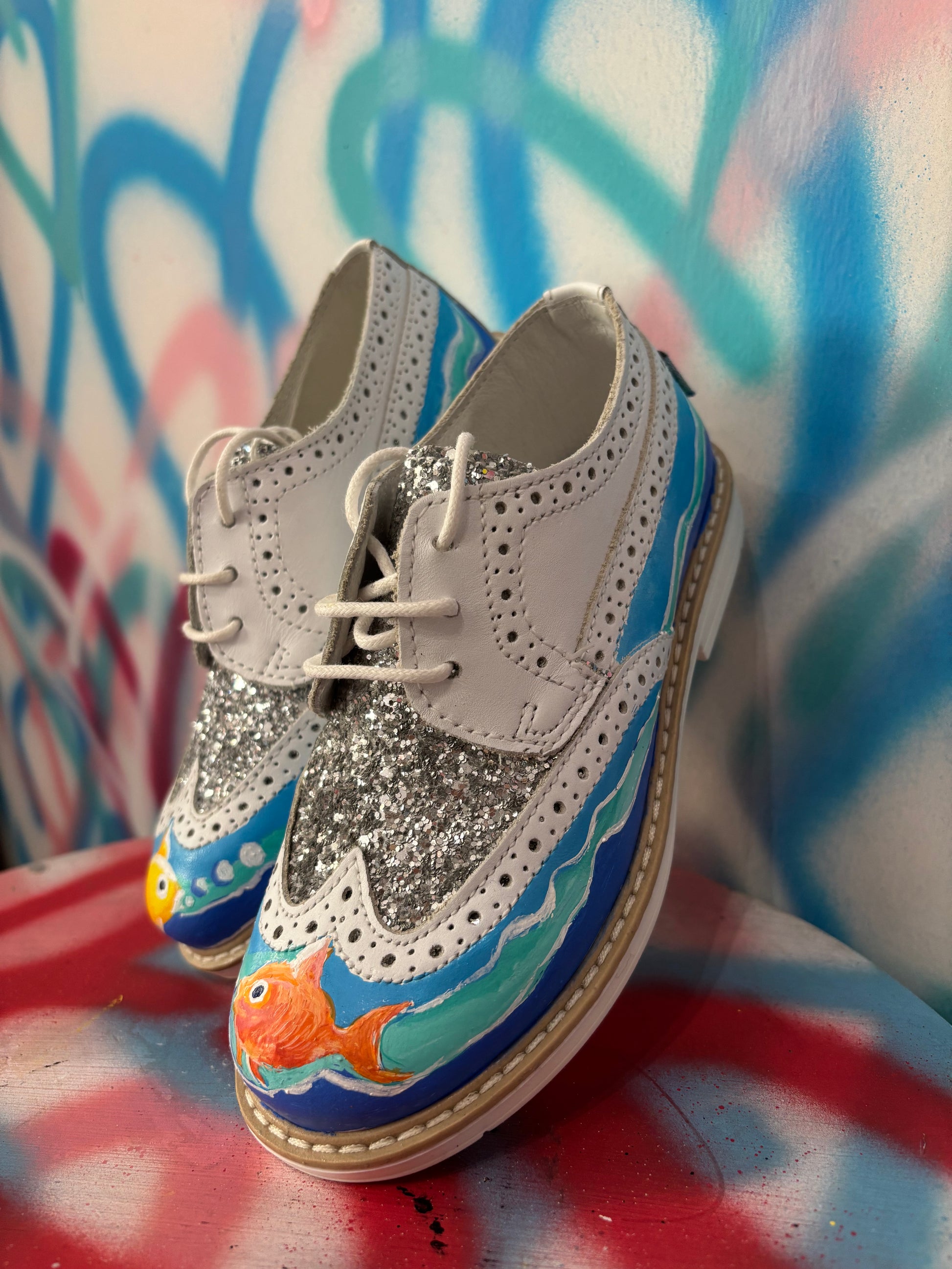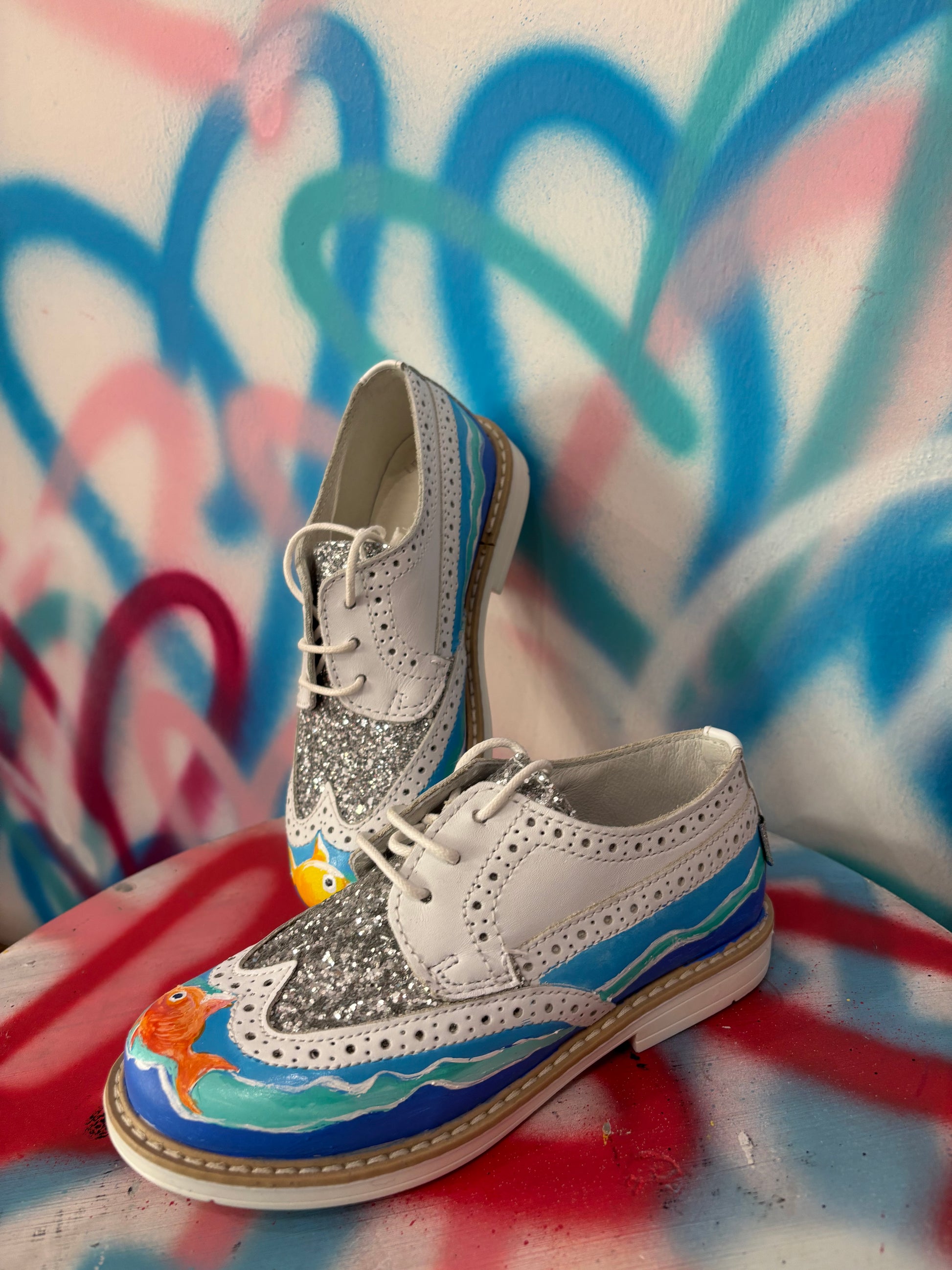 Le sneakers "Glitter pesci" offrono un perfetto equilibrio tra eleganza e comfort. Realizzate in vera pelle con un tocco di glitter e dipinta a mano.